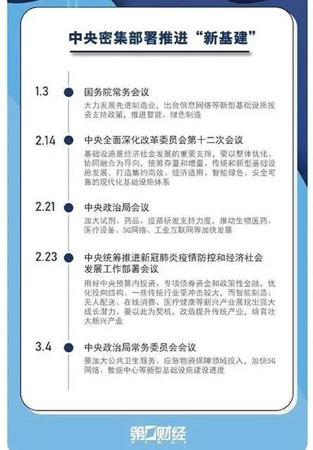 在此背景下(xià),根據第一(yī)财經梳理(lǐ)的(de∞©§)2020開(kāi)年(nián)以來(lái)中央密集部署推進∞↔ “新基建”的(de)時(shí)間(jiān)線,可(kě)以看(kàn)到(dào)中央在當前經濟形勢下(xià)對(duì)推動“新基建”的(de)決心巨大(dà)。