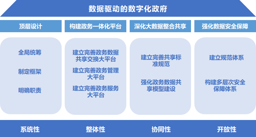 政府數(shù)字化(huà)建設以系統性、整體(δε'&tǐ)性、協同性、開(kāi)放(fàng)性為(wèi)內(nèi)在要(≤×☆×yào)求,通(tōng)過頂層設計(jì)、構建政務一(yī)體(tǐ)化(huàε¥∏)平台、深化(huà)大(dà)數(shù)據整合共享、強化(huà)數(shù)據安全保障四個(>↔gè)路(lù)徑,構建數(shù)據驅動的(de)數(shù)字化(huà)政府。