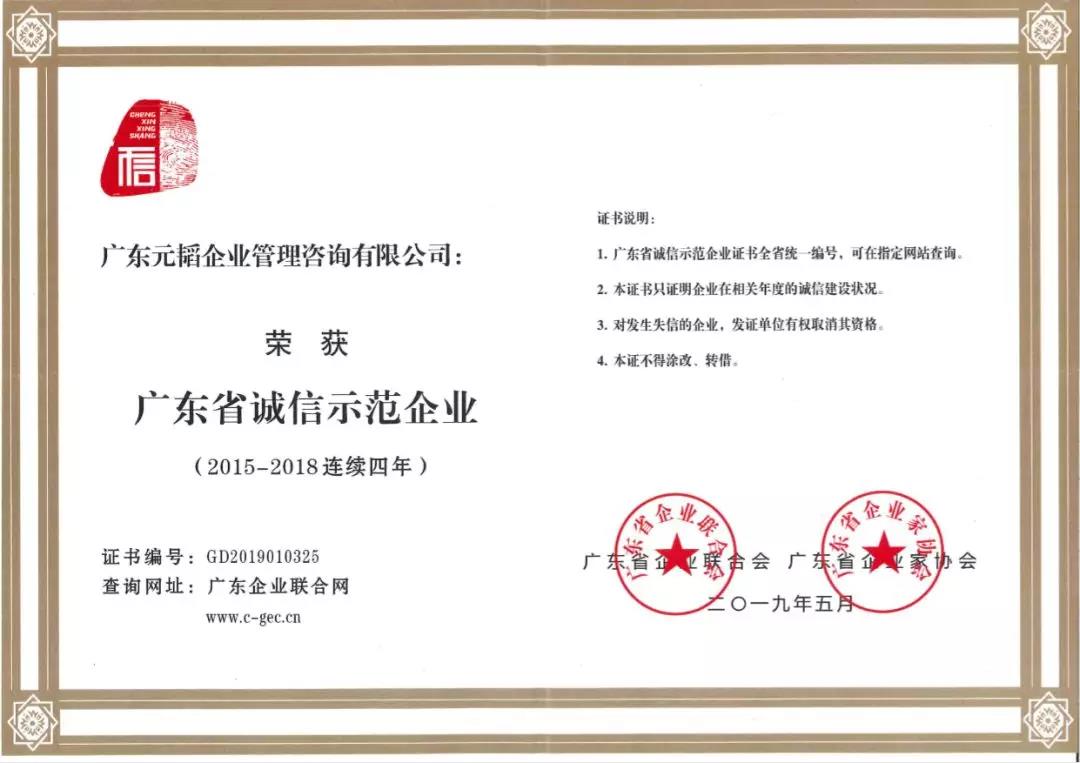 元韬公司2015-2018年(nián)連續四年(nián)獲得(de)“廣東(dōngφ↕)省誠信示範企業(yè)”