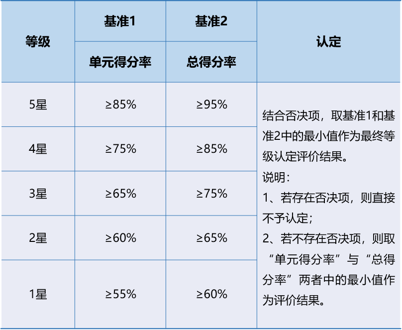 體(tǐ)系運轉的(de)整體(tǐ)績效以得(de)分(©©®fēn)率為(wèi)标準,采用(yòng)“雙基準”進行(xíng)認定,既考慮體(tǐ)系整體(tǐ)得(de)分(fēn)率,也(yěΩ→)需考慮體(tǐ)系單元得(de)分(fēn)率,同時(shí)還(hái)有(yǒ★÷ ±u)否決項。考慮體(tǐ)系單元得(de)分(fēn)率是(shì)為(wèi)促進體€$(tǐ)系建設的(de)整體(tǐ)性,避免某單元或要(yào)素建β↑設的(de)短(duǎn)闆。