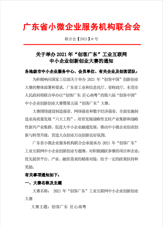 即日(rì)起,由廣東(dōng)省工(gōng)業(yè)和(hé)信↔→息化(huà)廳、省财政廳指導,廣東(dōng)省小(xiǎo)微(wēi)企業(yè)服務機(j¶& ī)構聯合會(huì)主辦的(de)2021年(nián)“創客廣東(dōng)”工(gōng)↑→∑業(yè)互聯網中小(xiǎo)企業(yè)創新創業(yè)大(dà)賽正式開(kā♠ i)始報(bào)名!
