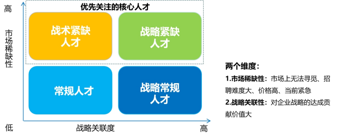 在明(míng)确人(rén)才戰略及人(rén)才發展思路(l¶ε"ù)後,就(jiù)要(yào)以此為(wèi)指導确定企業(yè)核心人(rén)才發展的§←(de)優先順序,聚焦資源,突破人(rén)才瓶頸。依據市(shì)場(chǎng)稀缺性、戰略關聯性這(zhè)兩個(gè)維度将人(rén)才分(fēn)為(wèi)¥★★÷四類,即戰術(shù)緊缺人(rén)才、戰略緊缺人(rén)才、戰略常規人(ré☆ n)才和(hé)常規人(rén)才,如(rú)圖所示。