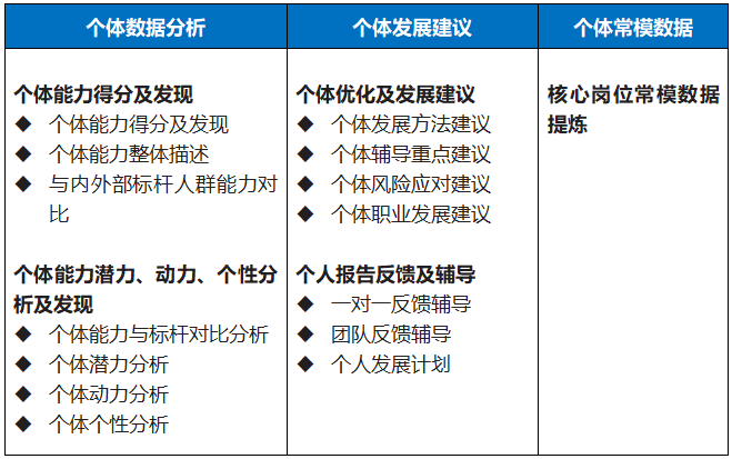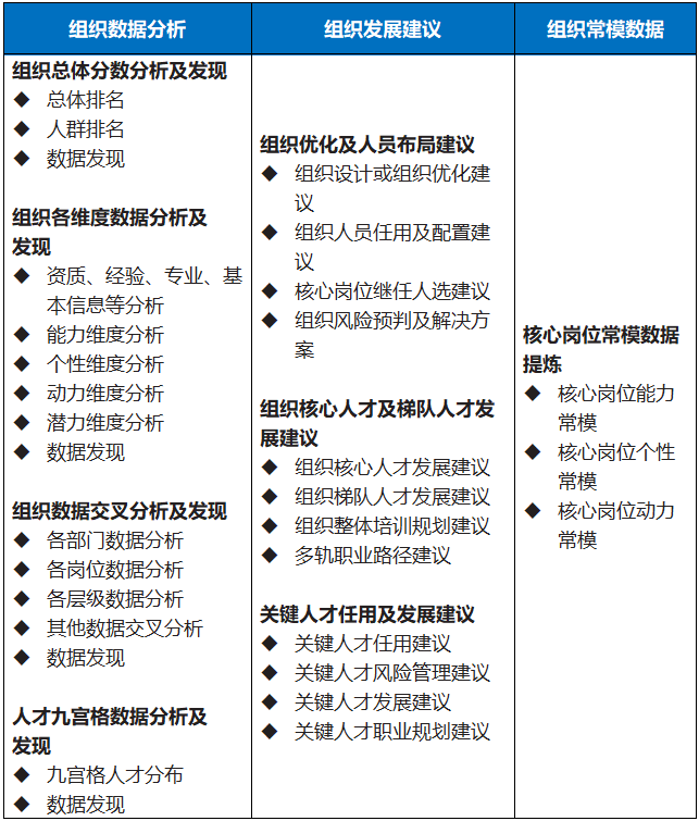 企業(yè)在完成“體(tǐ)檢”後,接下(xià)來(lái)就(∏≠jiù)是(shì)依據盤點結果“強身(shēn)健體(☆∏tǐ)”,利用(yòng)盤點數(shù)據優化(huà)組織效能(né↓ ♥σng)及提升個(gè)體(tǐ)能(néng)力,從¶$×(cóng)而達成對(duì)戰略和(hé)業(yè)務的(de)支撐作(zuò)用(↓λ±±yòng)。數(shù)據可(kě)從(cóng)數(shù)據分(fēn)析、發展建議(yì)、常模數(shù)據三大(dà)維度進行(xíng)分(fēn)析,基于數(sh₩&ù)據分(fēn)析結果,對(duì)存在問(wèn)題的(de)組織εγ及個(gè)體(tǐ),提出優化(huà)建議(yì),以及建立組織常模,用(yòng÷)大(dà)數(shù)據的(de)方式協助提高(g>&āo)業(yè)務開(kāi)展對(duì)人(rén)才決策的(de)效率和(hδ↓©δé)有(yǒu)效性,進而降低(dī)企業(yè)未來(lái)用(yòng)人(rén)≠¥→δ風(fēng)險,确保組織及個(gè)體(tǐ)效能(néng)的(de)産出。如(rú)下(xφ↓φ∞ià)表所示。