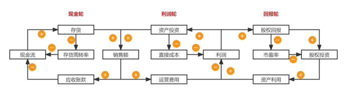 前面的(de)“四則運算(suàn)”幫助我們提煉出“三表”中∏≈的(de)關鍵财務指标,而資産負債表、損益表和(hé)現(x×β¥$iàn)金(jīn)流量表分(fēn)别指向“股東(dōng)回報(§€bào)”、“公司利潤”以及“現(xiàn)金(jīn)流”;為π(wèi)體(tǐ)現(xiàn)“三表”關鍵指标之間(jiān)的(de)邏輯關γ₩系,嘗試構建出由“現(xiàn)金(jīn)輪”、“利潤輪”和' ♦×(hé)“回報(bào)輪”三輪驅動的(de)企業(yè)飛(fēi)輪系統。基于商業(yè✔λφσ)邏輯,三個(gè)輪子(zǐ)的(de)鏈接點分(fēn)别是(shì)“銷售額”和(hé)δ“利潤”。