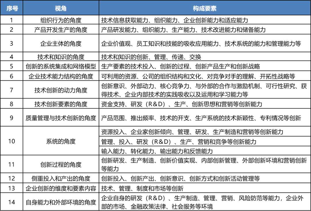 創新能(néng)力是(shì)技(jì)術(shù)和(hé)各種實踐活動領©¥≈¥域中不(bù)斷提供具有(yǒu)經濟價值、社會(huì)價值、生(shēng)态價值€↕的(de)新思想、新理(lǐ)論、新方法和(hé)新發明(míng)的(de)能(néng)力。∏•≠而企業(yè)創新能(néng)力的(de)構成要(yào↕"←∞)素可(kě)以基于不(bù)同角度進行(xíng)劃分(fē♣λ×n),其中國(guó)內(nèi)外(wài)比較有(yǒu)代表意≠→σ義的(de)觀點如(rú)下(xià)表所示: