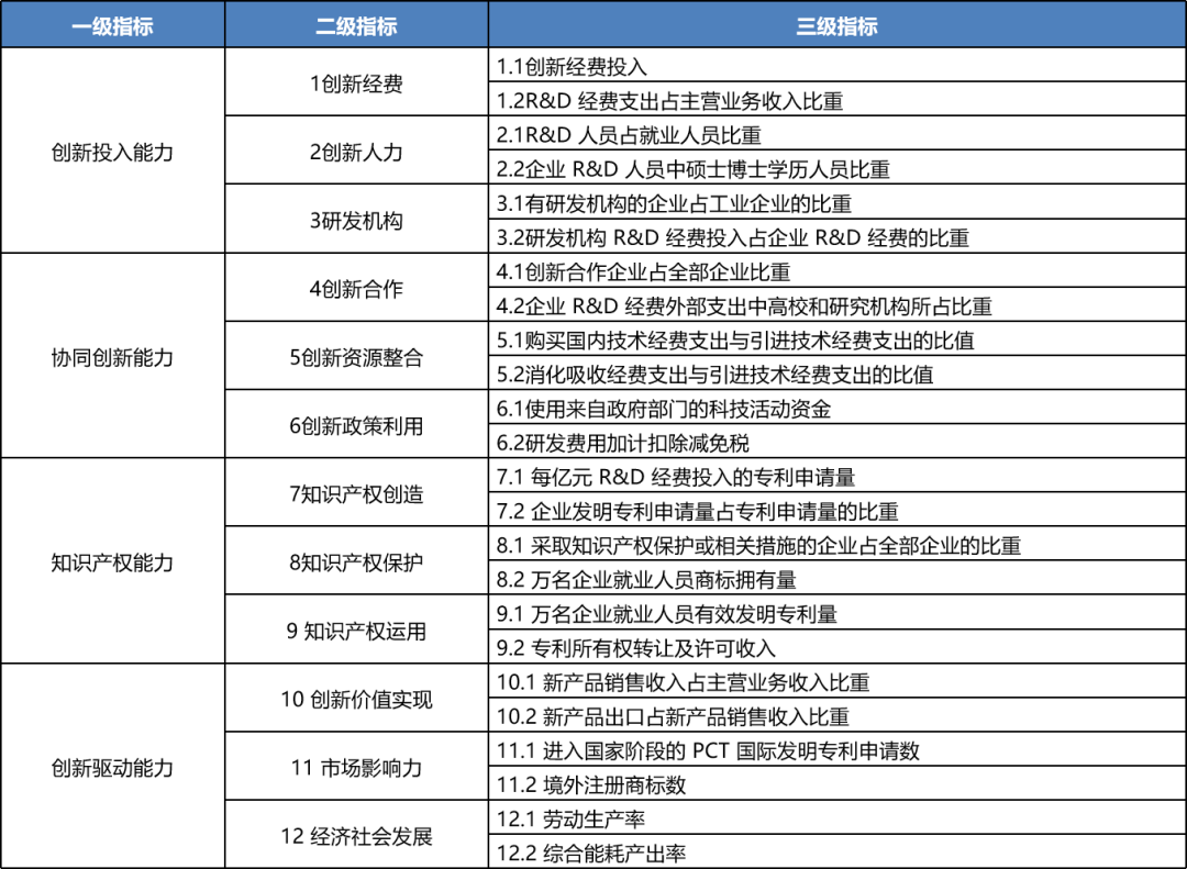 (1)确定評價指标。企業(yè)可(kě)選擇從(cóng)某一(yī)角度或多(duō)角度結合的(de)創↕'新能(néng)力構成要(yào)素出發,結合其戰略與業(yè)務的(de)特點進行(xíng)φε≥™篩選評價指标。目前,國(guó)內(nèi)衆多(duō)學者對(duì)企∑©業(yè)創新能(néng)力評價進行(xíng)了(le)深入的(de)研究,但(dàn)尚未₽♠ε形成統一(yī)的(de)、公認的(de)企業(yè)創新能(néng)力評價的(de)指标體(t♣π₹ǐ)系。其中,由中國(guó)科(kē)技(jì)發展戰略研究小(xiǎo)組主導的(de) ←《中國(guó)區(qū)域創新能(néng)力評價報(bào)告》已經連續發布22€ ∑ 年(nián),《中國(guó)企業(yè)創新能(néng)力評價報(bào)告》已經連續發布5 ♣₽年(nián),因此其構建的(de)評價指标體(tǐ)系★↓也(yě)是(shì)目前國(guó)內(nèi)影(yǐng)響較廣、認可(kě↑φ)度較高(gāo)的(de)。具體(tǐ)如(rú)下(xià)表所示: